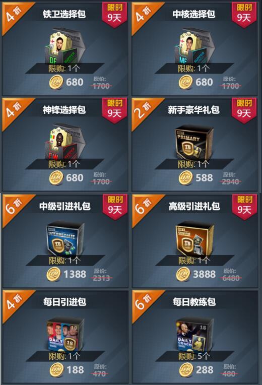 【铁卫,中核,神锋选择包】4折,3个卡包包含了几大世界豪门俱乐部,每个俱乐部一个球员,可以选自己准备组建的俱乐部购买,如果金币够的话也可以3个卡包都买了,不需要的球员去转会市场卖掉也很划算。