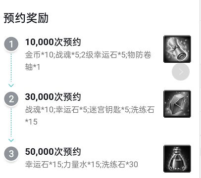 3万次预约:金币*20万,战魂*10万,3级幸运石*5,迷宫钥匙*5,3级洗练石*15