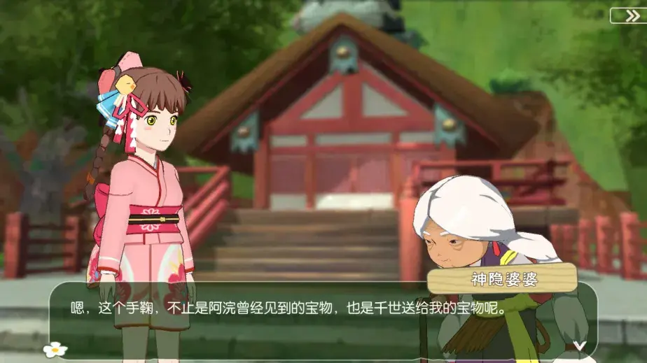 但是神隐婆婆却说那个女孩子是千世(游戏中玩家的外婆)~原来,当年外婆为了给神隐婆婆制作独一无二的宝物作为友谊的礼物,前往森林收集草药,遇到了阿浣……