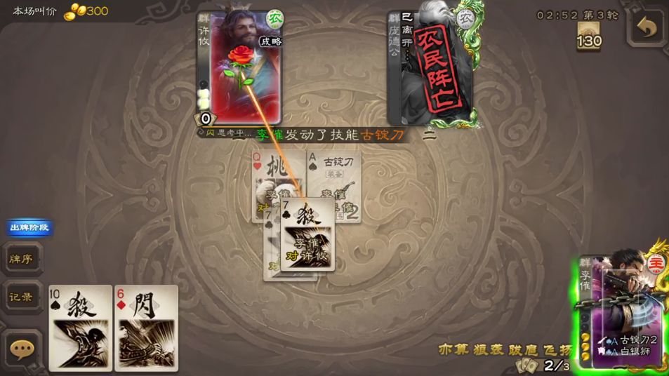 而到一血许攸的回合,直接砍掉了我5点体力,就差那么一张杀就翻车了,所以真的觉得6血在高爆将面前很皮实?脆皮罢了。这也是我刚说的,你刷输出就必定防御空虚,那么很容易翻车,但碰到这种组合的农民,你只有赌一把,因为他们动起来那可不止挂掉你一层皮那么简单。