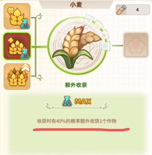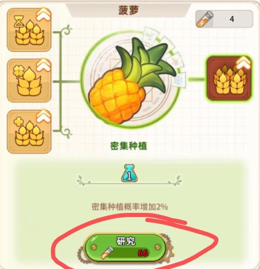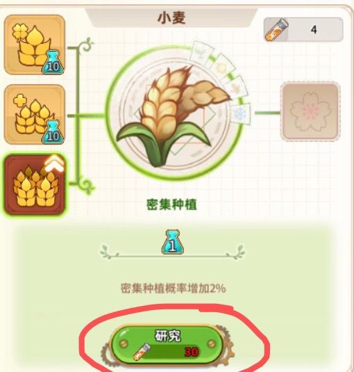 收获的双倍农作物与研究所叠加(额外),四级研究所升级后小麦密集需要30试剂点一级,一级增加2%概率,一共十级20%概率,从小麦到菠萝每个作物递增3个试剂,30-66个。