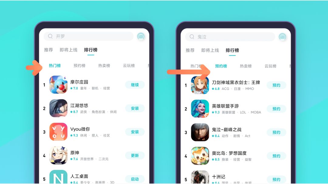"我的游戏"界面,云玩Tab增加了云玩推荐位置和云玩榜单,方便大家更多地探索好玩的云游戏;同时预约Tab增加了近期已上线和即将上线位置,完善了整体的预约服务~