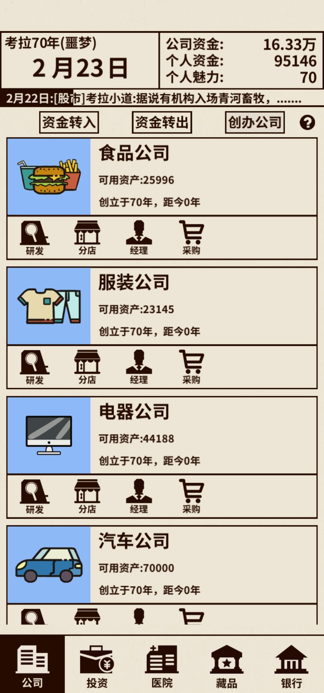 存钱买股票,给食物和服装把经营线点满,然后食物点到双层牛肉堡,服装点到连衣裙,只买2人口的分店。接下来看股票,公司科技有时间就点,公司科技的点法参照我服装与食品公司的点法,经营线拉满优先于产品升级。