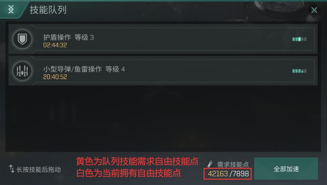 如果打算加速技能,只需要点击全部加速即可,在自由技能点小于所需技能点时,系统会自动按照队列从上到下加速技能的学习。