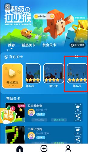 3. 除以上两款游戏,APP首页任意一款游戏官方关卡通关(例:超级拉亚猴通关官方16关)