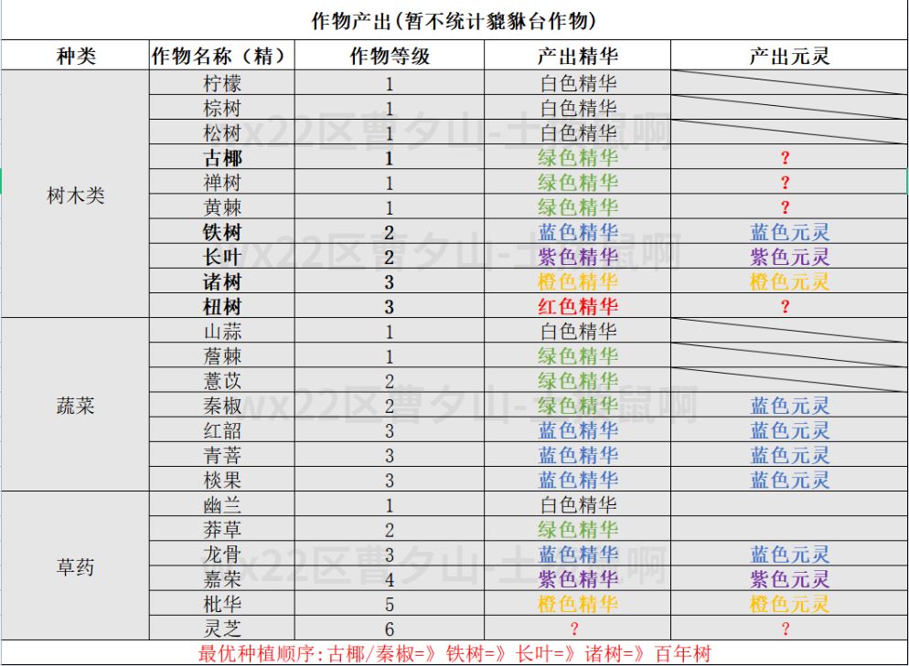 ),目前一天种地四轮,种植作物为铁树和长叶,种植时间分别为7点,12点,6点,11点。再强调一下最优方案:古椰/秦椒=》铁树=》长叶=》诸树