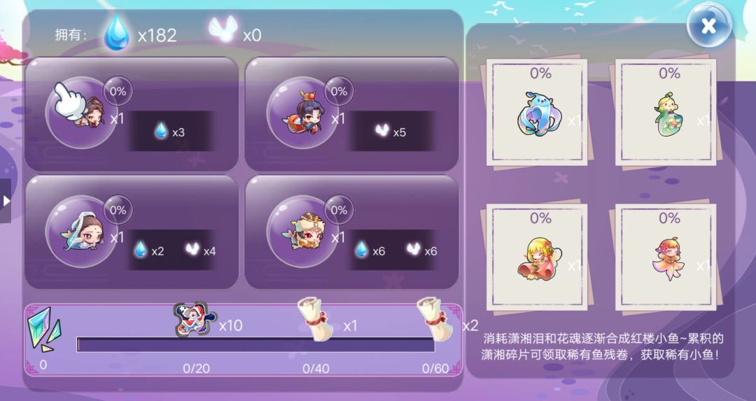 选择一只喜欢的小鱼,使用潇湘泪、花魂去合成,积累左下方的碎片积分收取稀有鱼残卷,兑换右侧稀有鱼~
