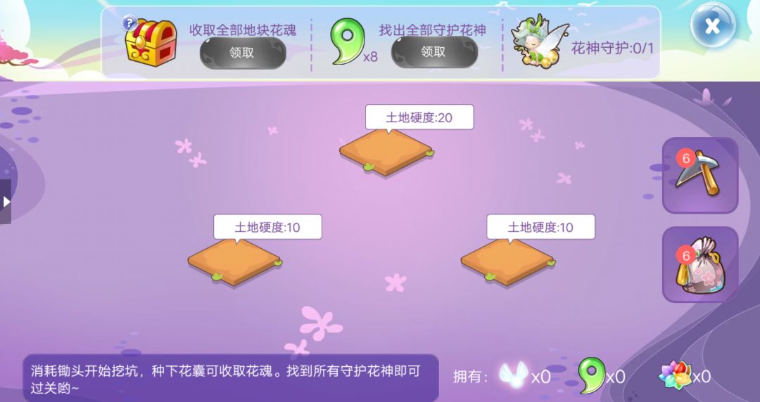 完成葬花,收取【花魂】,如果土地为彩色则遇到了守护花神;注意界面上方的宝箱:收取全部地块花魂可领取宝箱,找出全部守护花神可以领取【守护玉】。