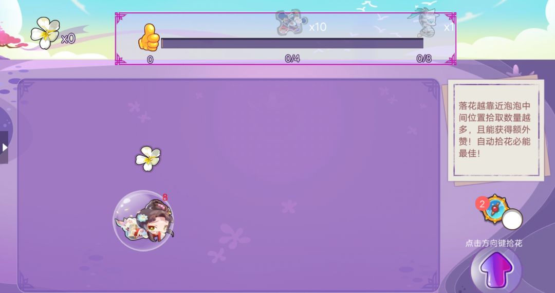 进入拾花环节,如图黛玉位置会进行左右移动,点击右下角向上按钮可以控制她的移动,注意提示:让花碰到泡泡中间位置拾取到的最多,而且还能获得【赞】