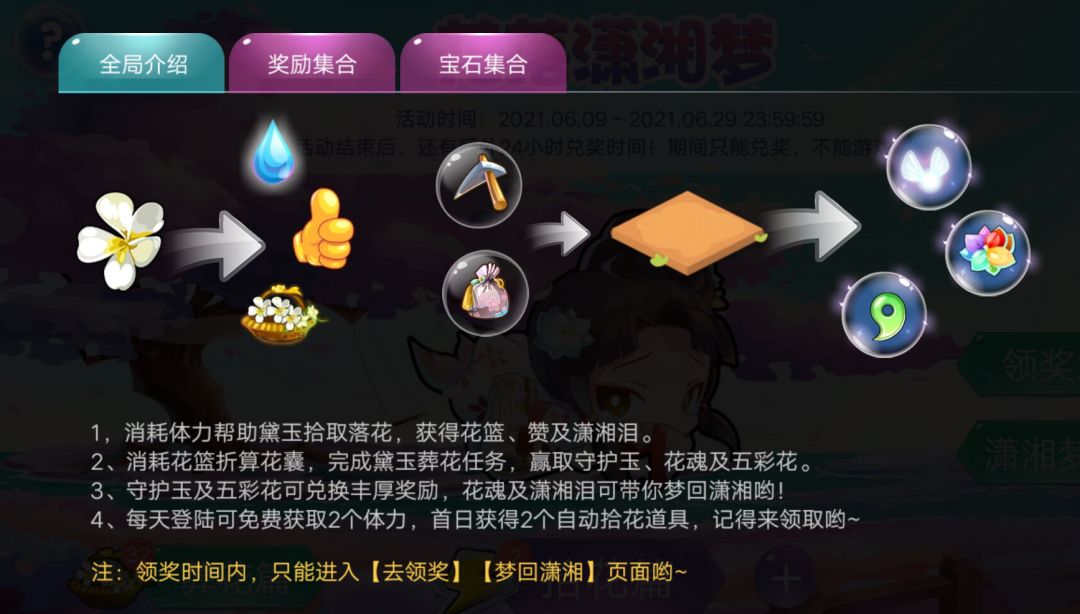 活动主要分为四部分:拾花篇☞葬花篇☞潇湘梦回☞领奖(即活动参与顺序),下面将为大家介绍每个部分的玩法技巧~