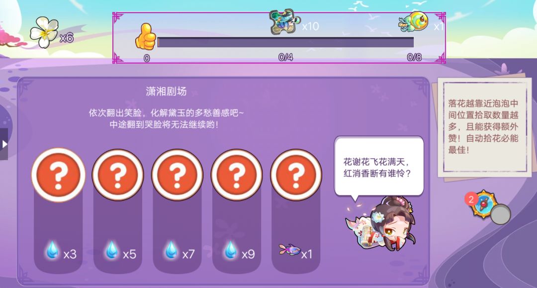 碰到花花后,可能出现随机事件,这次遇到了小剧场~从左到右点击问号进行查看,遇到笑脸可获得泪珠并继续,哭脸则停止;