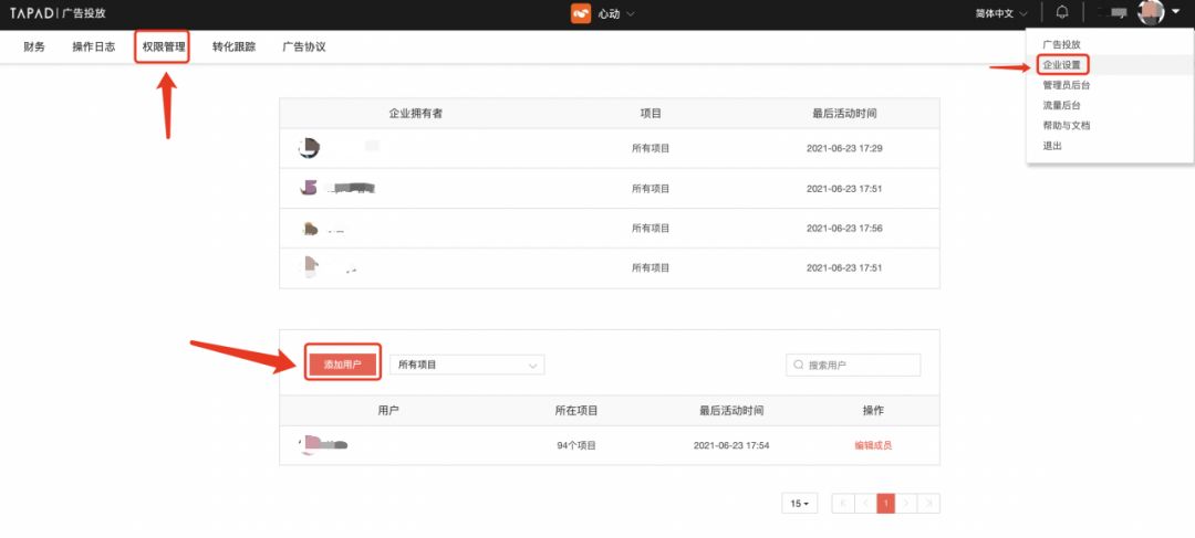 1. 进入投放后台界面后,点击头像下方,选择企业设置 - 权限管理