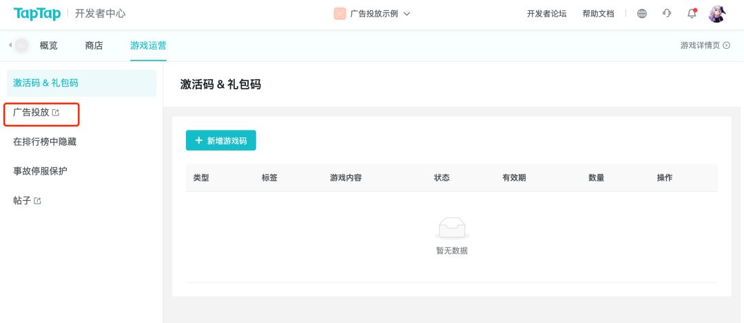 广告投放后台地址:https://biz.taptap.com/ ,也可通过各个游戏内 游戏运营- 广告投放能力进行跳转,