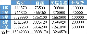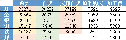 然后是三种加工方式【购买、自搓、买煤自搓】分别的消耗
