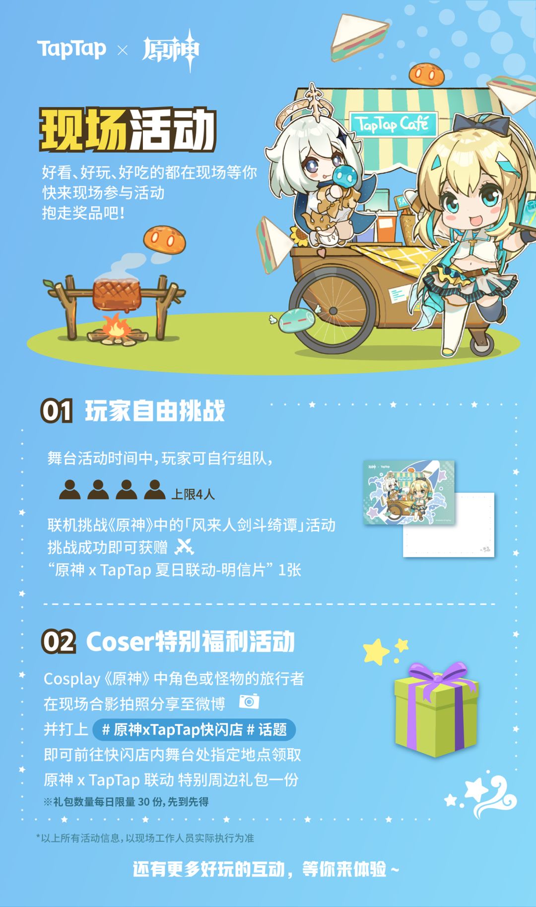 听说现场有主题游园、TapTap Cafe、游戏挑战还有联动周边~百分百期待!嗒啦啦准备好了!你们呢~(✪ω✪)