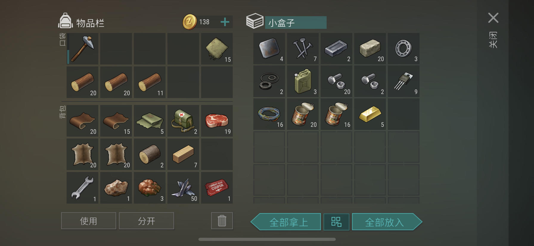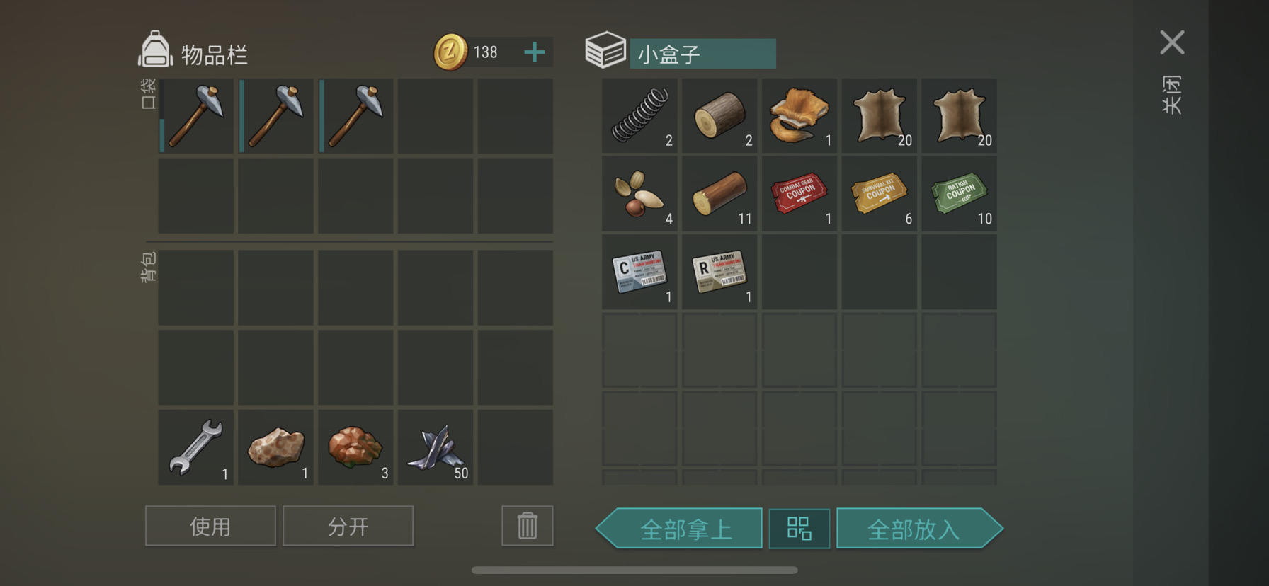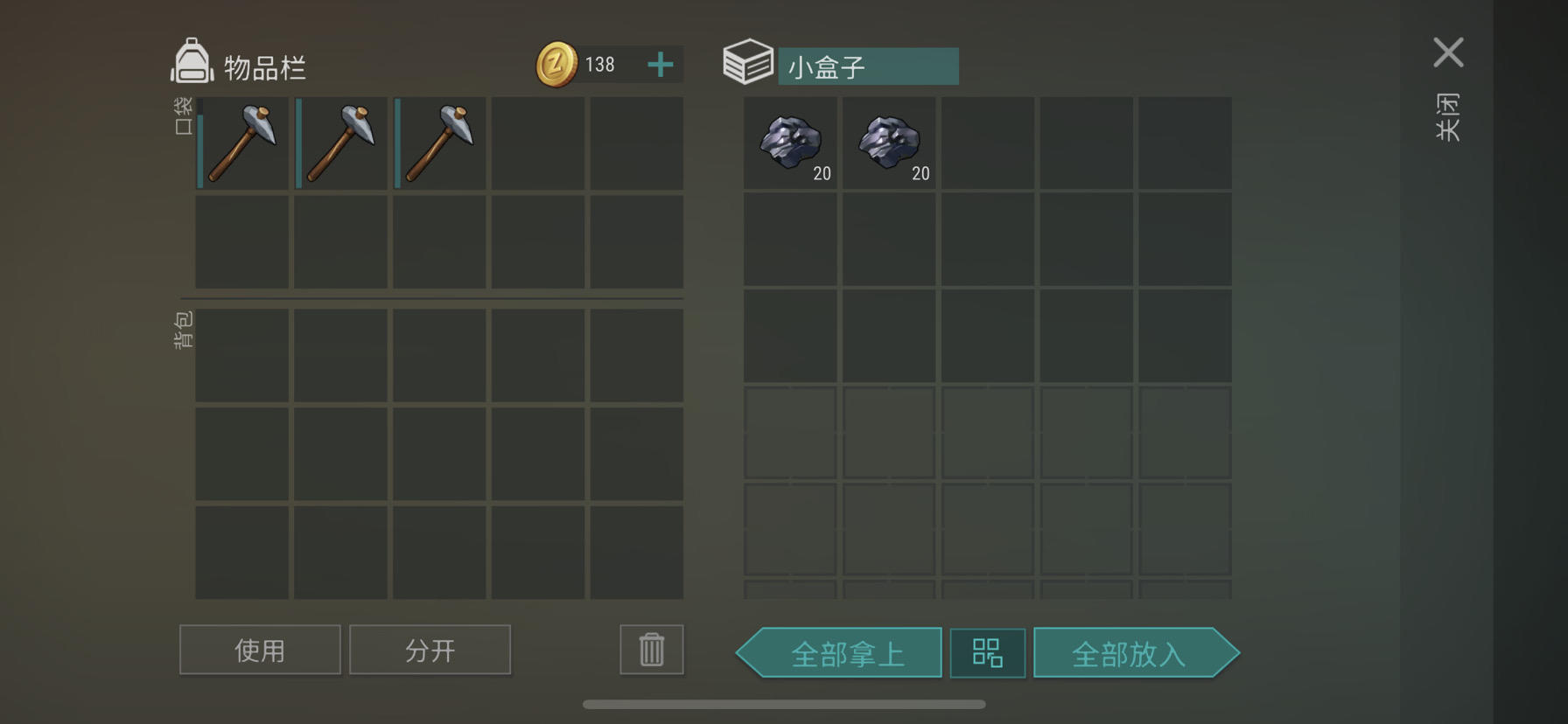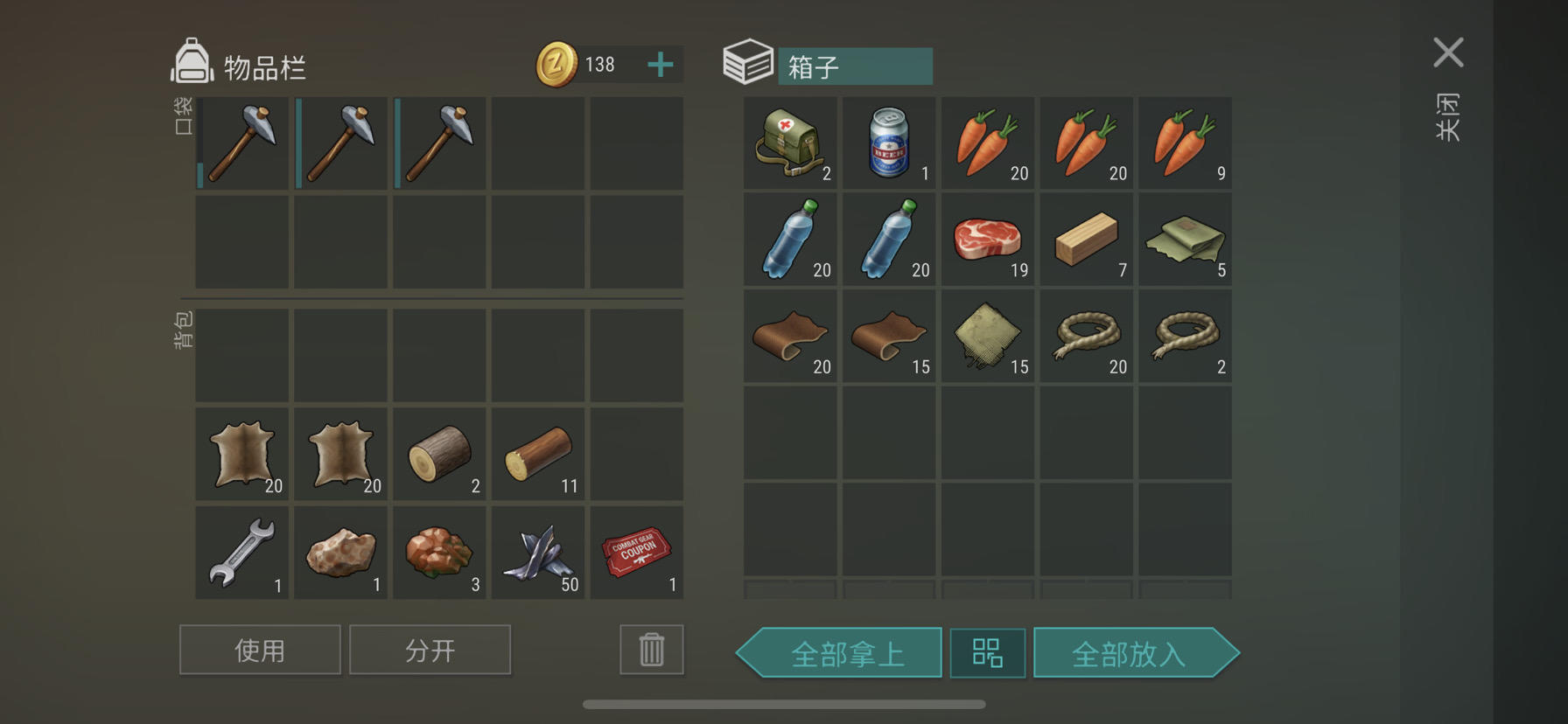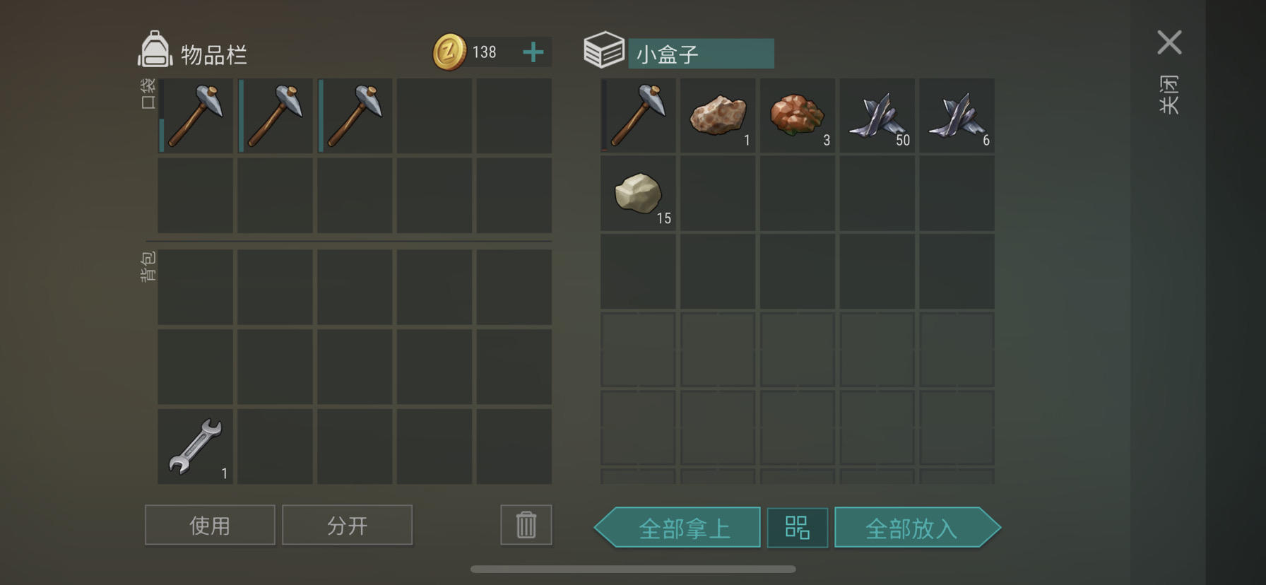 PS:该方案可卡怪。熔炉有18铁矿石;两个木工台各有一组原木;制皮架有10绳子;营火、工作台空;缝纫机有10布片;菜地有10种子+一组胡萝卜。没有二级斧的可以多带把一级斧从下图进入😏