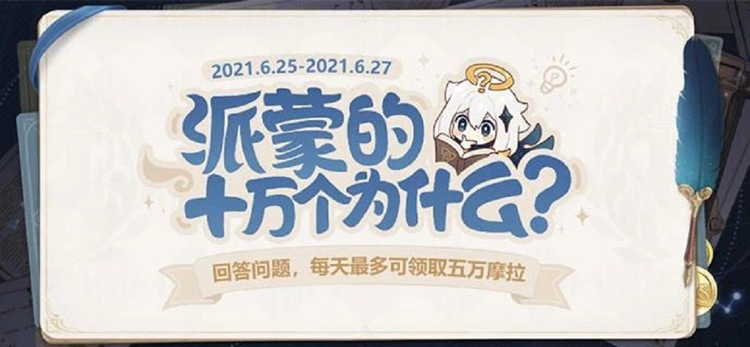 今天原神更新了派蒙的十万个为什么问答活动,每天10道题目,每个人的题目和选项位置各不相同。每答对1题,可获得5千摩拉,每天最多可获得5万摩拉。