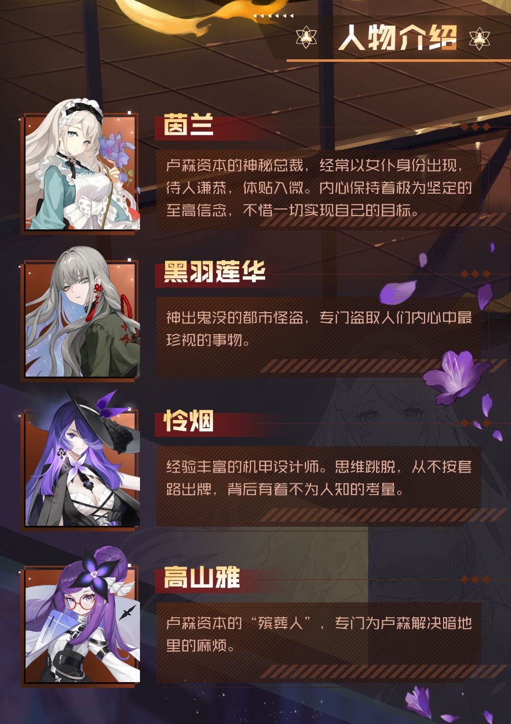 新篇章剧情即将展开,神秘总裁茵兰遇见神出鬼没的都市怪盗黑羽莲华,会碰撞出怎样的火花?来自卢森资本的怜烟会有怎样的选择?“殡葬人"高山雅的出现又预示着什么样的危险正在逼近呢......新篇章即将开启,让我们拭目以待。