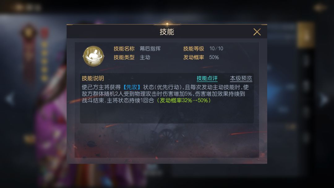 宁宁的搭配主要围绕其技能中的负面组建,所以作为主动队伍辅助使用,如宫本武藏这类主要使用主动技能的将领与她就非常契合,每回合释放技能时都有机会多次触发幕后指挥的减益。也只有这类纯主动将领才能将幕后指挥的效果发挥到最大。