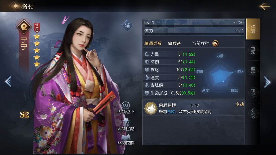 宁宁拥有不错的谋略成长与速度成长,她在发动技能后能为主将提供先攻状态,并让其在每次使用主动技能时,都为敌方施加一个增伤debuff。5统御的设定会比另外两名将领更快使用到阵容中,考虑其先攻施加需主动技能触发,建议主加速度保证主将的先手率。
