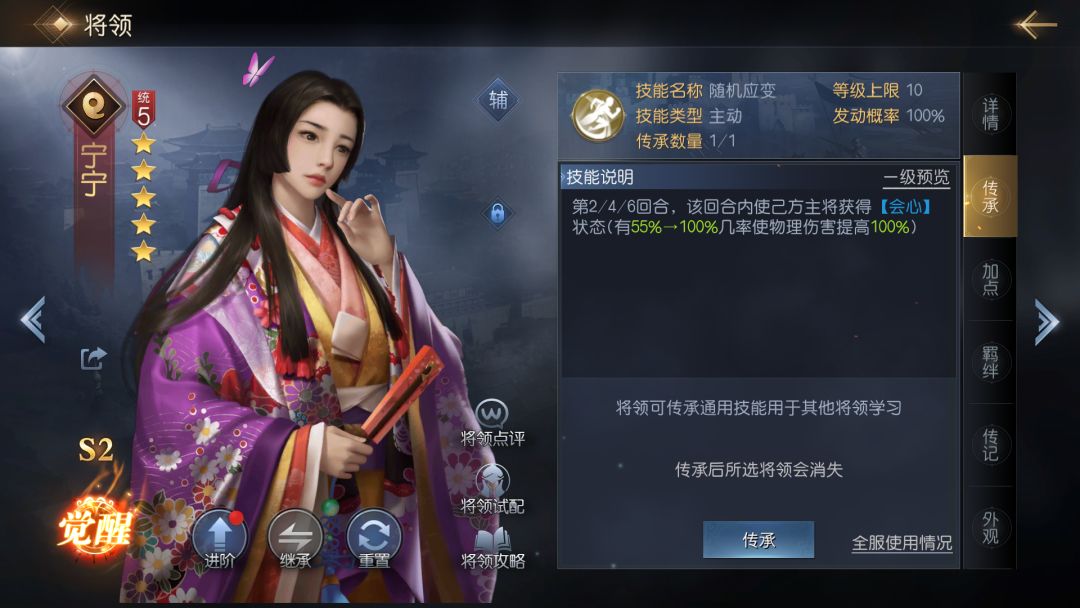 宁宁的传承技能效果非常简单,在特定的3个回合内使己方主将获得100%的会心状态,该技能3个发动回合与织田信长的输出回合完全相符,能为其提供高额的爆发能力,不难看出该技能是为织田信长准备。