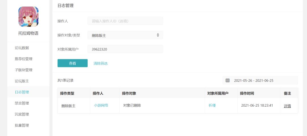 因托拉姆物语社区版主 祈瑾(ID:39622320)在游戏内进行违规交易,违反托拉姆物语用户守则,游戏账号于6月10日被官方封禁,其行为已违反 TapTap论坛版主规范与行为管理 及