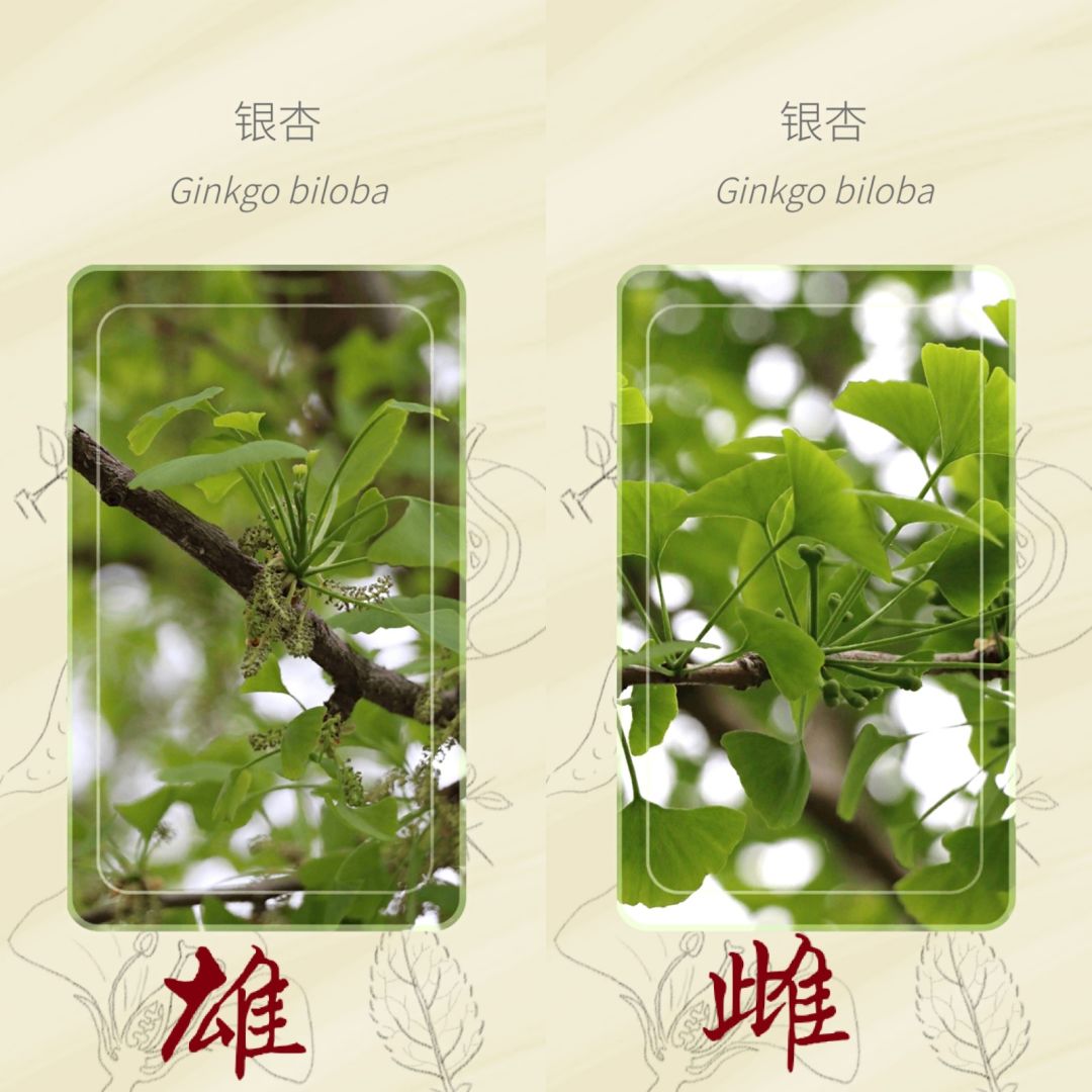 银杏,花梗长而明显,柔荑花序,有两种单性花,有雌雄花的题目(附图),单叶,开花时叶子正在发芽,单果。