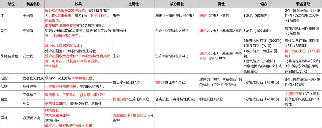 其它属性中,暴击(80%)、闪避(20%)、格挡(80%)、吸血(40%)尽量满,穿透和额外穿透合尽量100%。