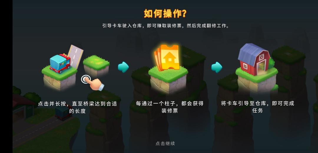 按住屏幕路面就会延长,一定要测量好路程,在山崖上建造公路,到达终点的仓库才算完成,才能获得装修票。公路不能太长也不能太短,不然小货车就会掉落悬崖。