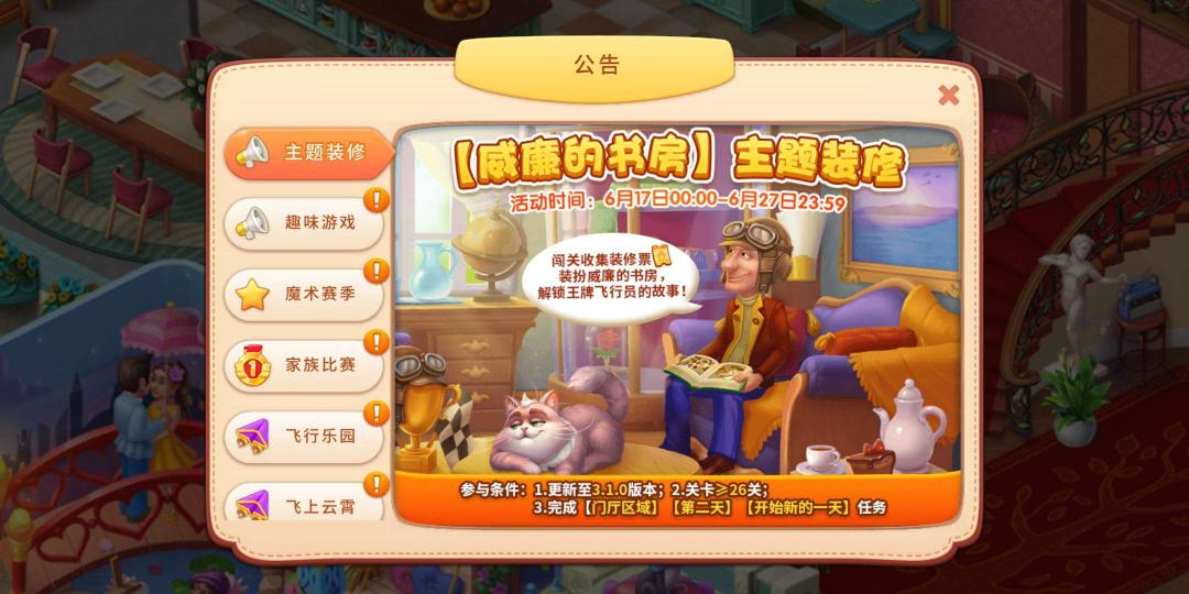 (闯关收集装修票,装扮威廉的书房,解锁王牌飞行员的历史故事)