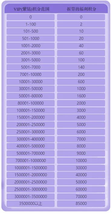 不同紫钻积分档位将对应活动期间可以获得的福利积分的总数量!紫钻积分越多,可折算的福利积分则越多哦~