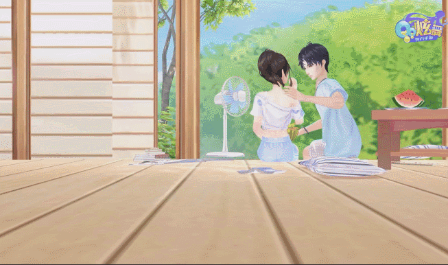 知了声声,冰凉的西瓜好似不能驱赶夏日的酷热,女孩趁着男孩不注意,偷偷地对着风扇吹了吹脸~