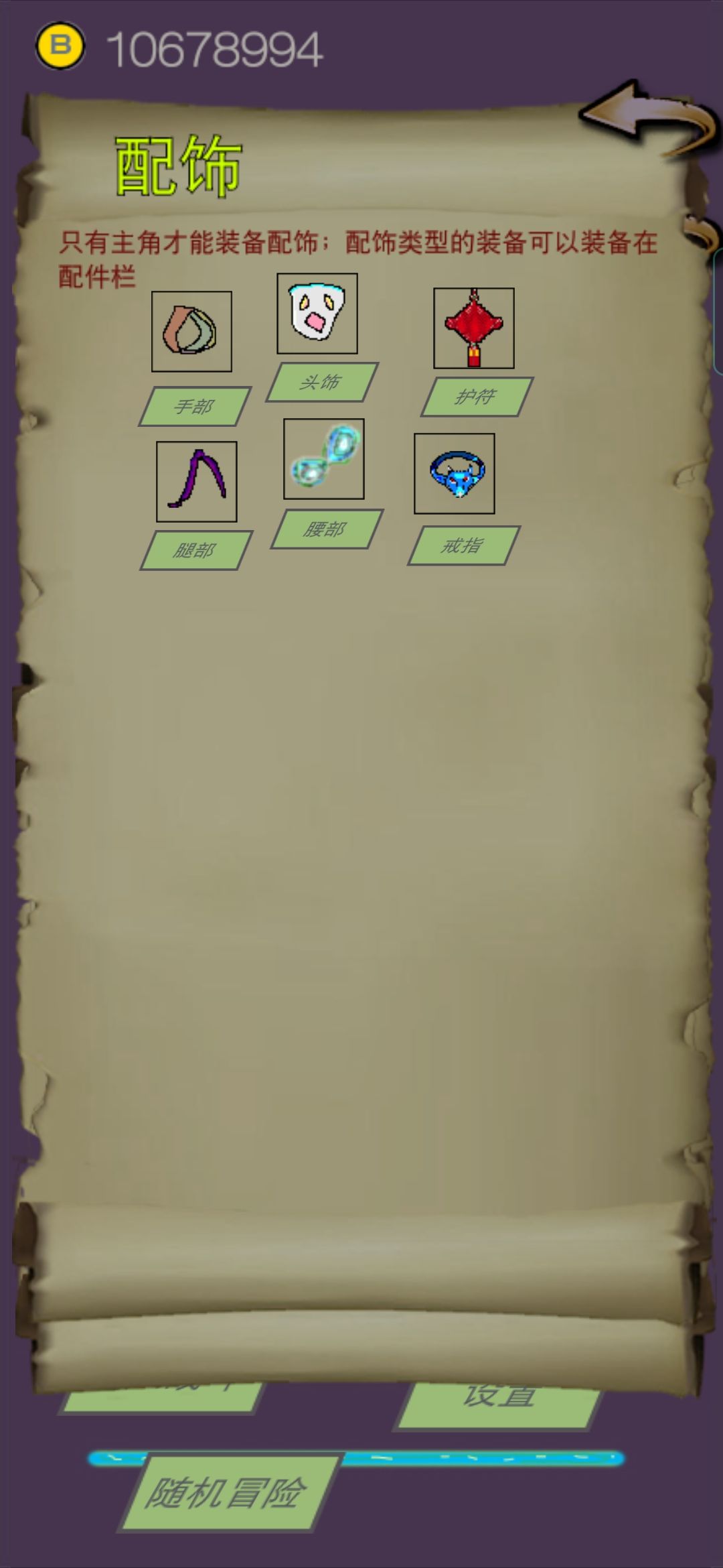 只有主角有配饰栏,分为手部、头部、护符、腿部、腰部、戒指六类,只可装备属于相对类型的配件,配饰栏的装备会像配件一样正常提供属性。