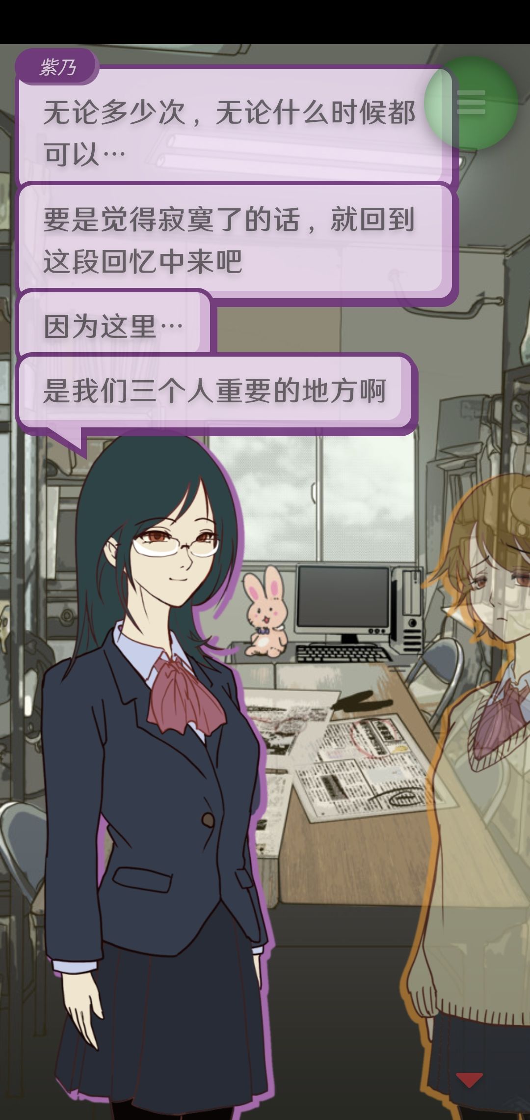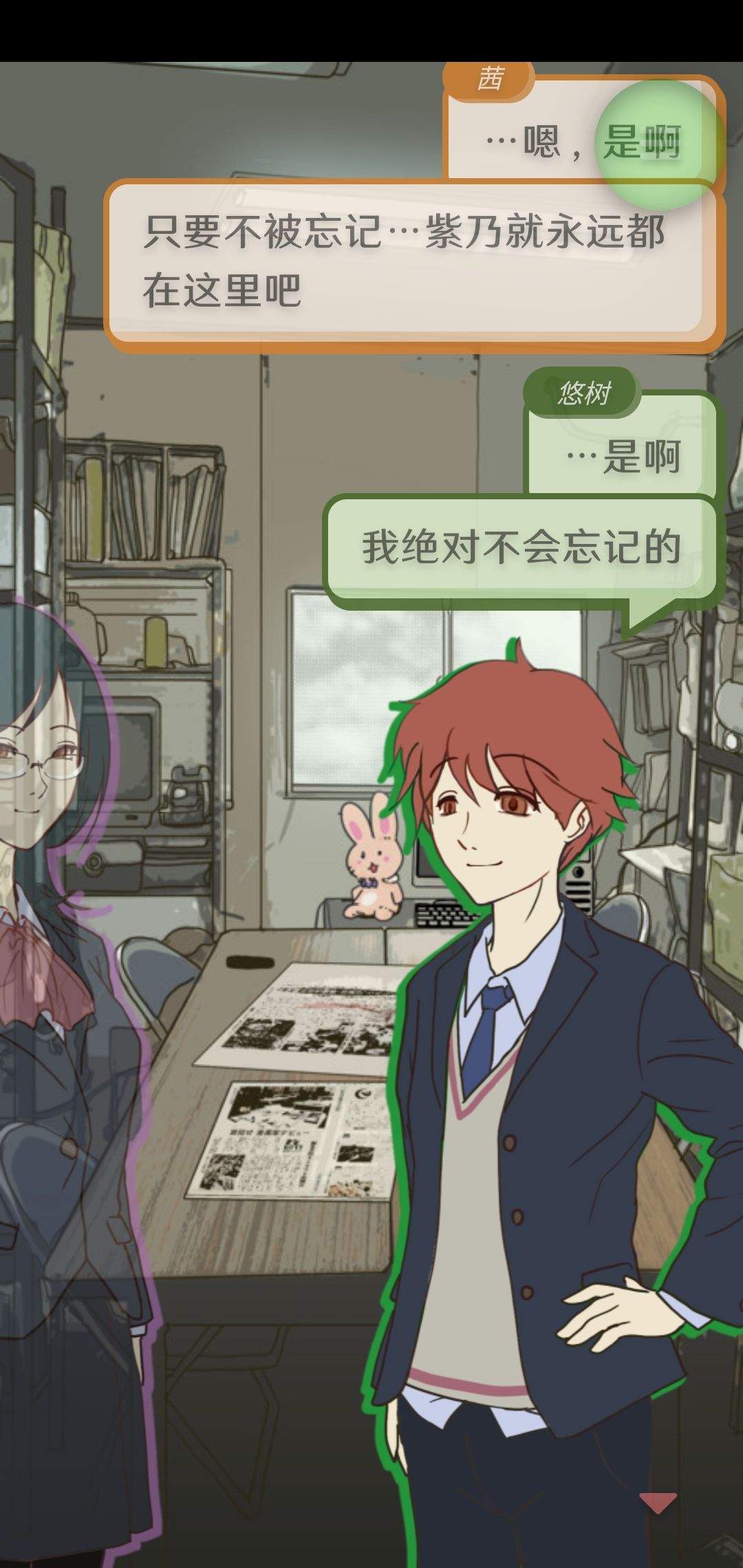 在我看来,虽然后面几章没有第一章吓人(第一章收集坏结局的时候我用纸遮着三分之二玩的),但后面的剧情对新闻部三人组的角色塑造更好,六、七两章、番外和彩蛋可以说是游戏核心的体现——信任、互帮互助与羁绊。全部体验完后有一种莫名的感动感。