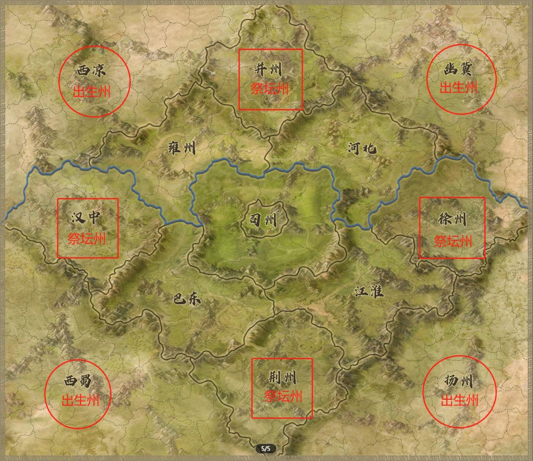 “天命四方”中将出生州数量削减到了4个,资源州数量提升至8个,四座祭坛分别位于对应东南西北的并州(福祚坛)、汉中(文成坛)、荆州(楚王坛)、徐州(武德坛)四个州,占领的祭坛将给予玩家联盟军团加成,并降低联盟攻打司州城市的难度。