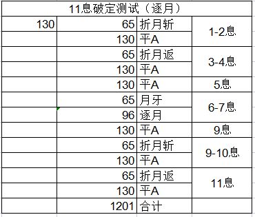 1、11息破定测试,技能佩戴 长歌行、折月、月牙、逐月。结论:130重量,11息折月返接强化平A后完成1200破定。