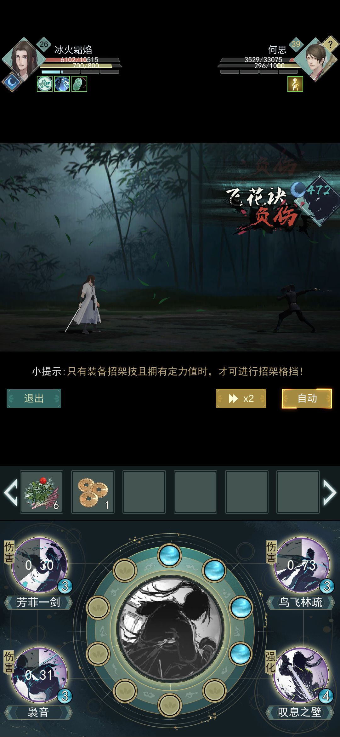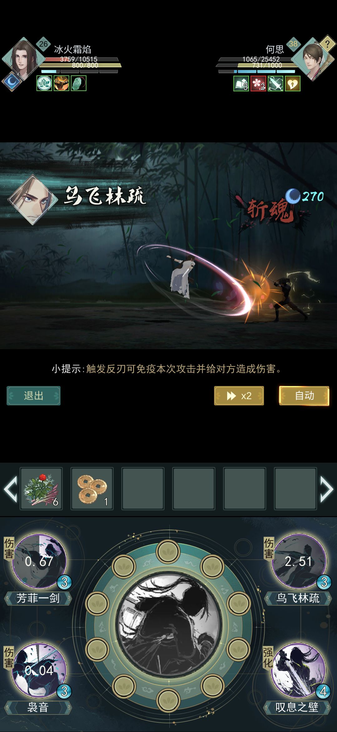鸟飞林疏:概率附加的反刃攻防一体,不过cd有点长,大概为十二息,所以在叠花印方面不如芳菲一剑,平均四息剑意消耗≈1