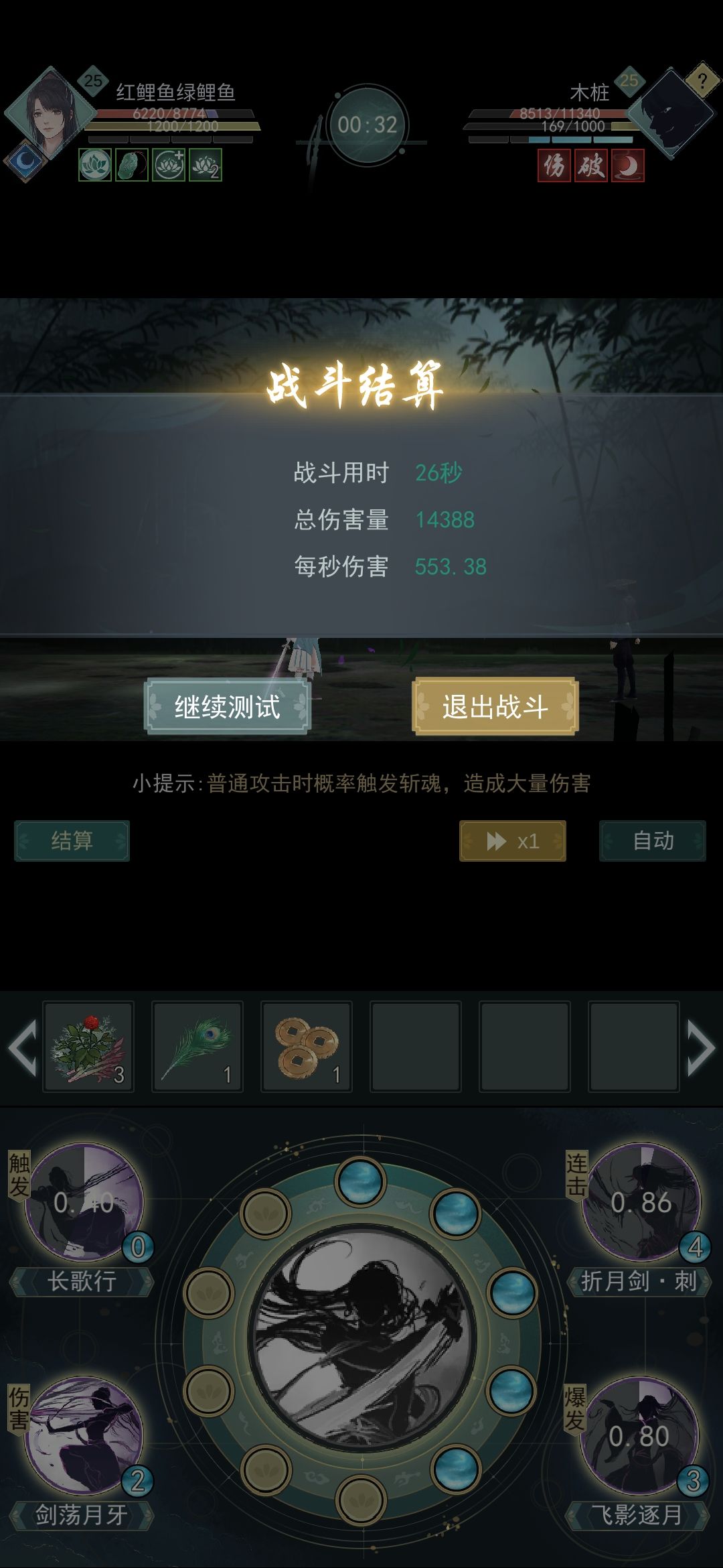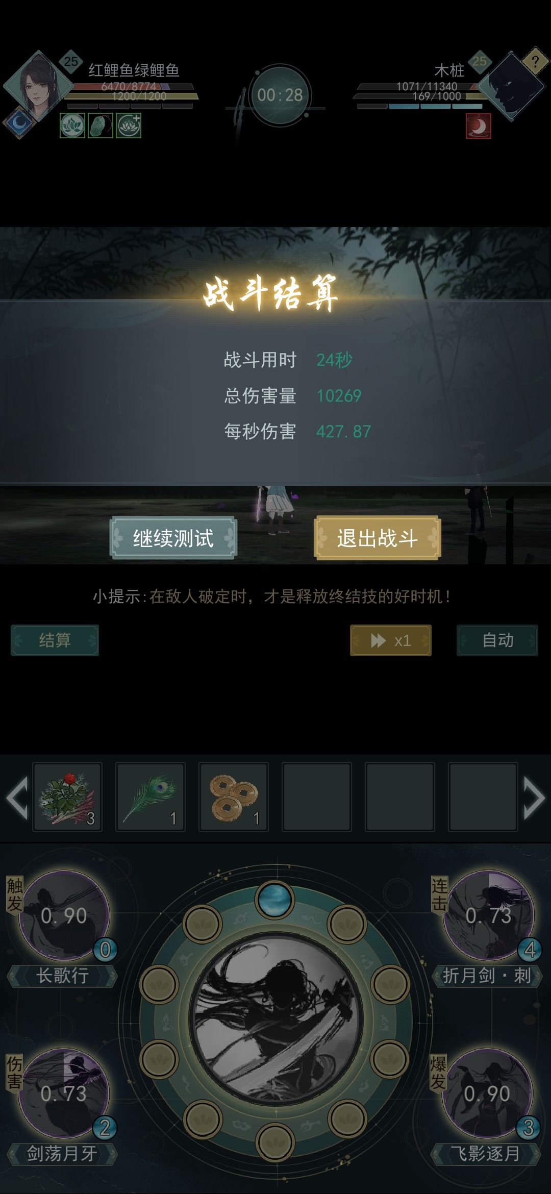 我0息普攻、长歌行、剑荡月牙(非必备)、飞影逐月。打完收工(等死)。