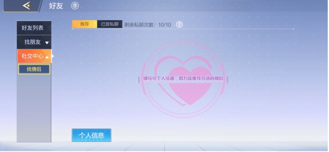 可点击右下角【找情侣】按钮挑选情侣,若暂无可交往异性好友,则可点击【推荐情侣】按钮,页面将跳转至【好友-社交中心-找情侣】,赛车手们可在此页面查看其他异性玩家~