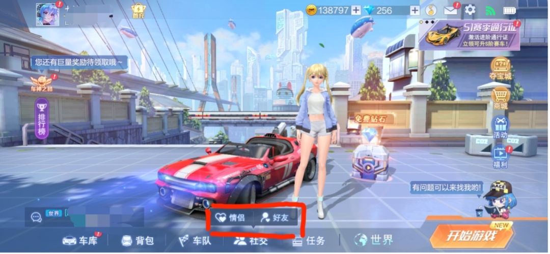 游戏内的社交关系主要包含【情侣】、【好友】两种。赛车手们可以在游戏主页面的【社交】栏目里找到相应的进入按钮~