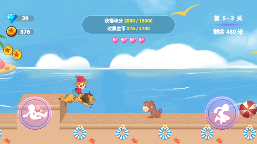 游戏过程中玩家可以通过跳跃或滑行躲避障碍物,同时玩家需在每个关卡收集积分和金币来达成通关条件。