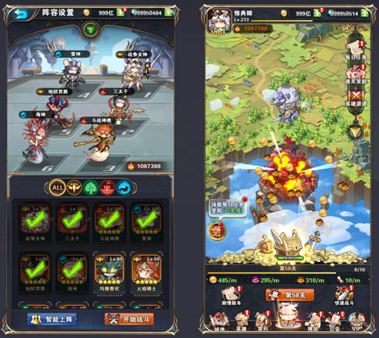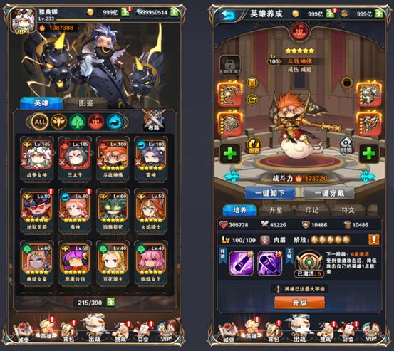 游戏采用了全自动挂机与功能玩法结合:进入游戏后便可自动遇敌,到达挑战首领条件,即可手动挑战,成功进入下一层,简单易懂;加入英雄阵营,使游戏内排兵布有更多的选择和搭配,为战斗增加乐趣。
