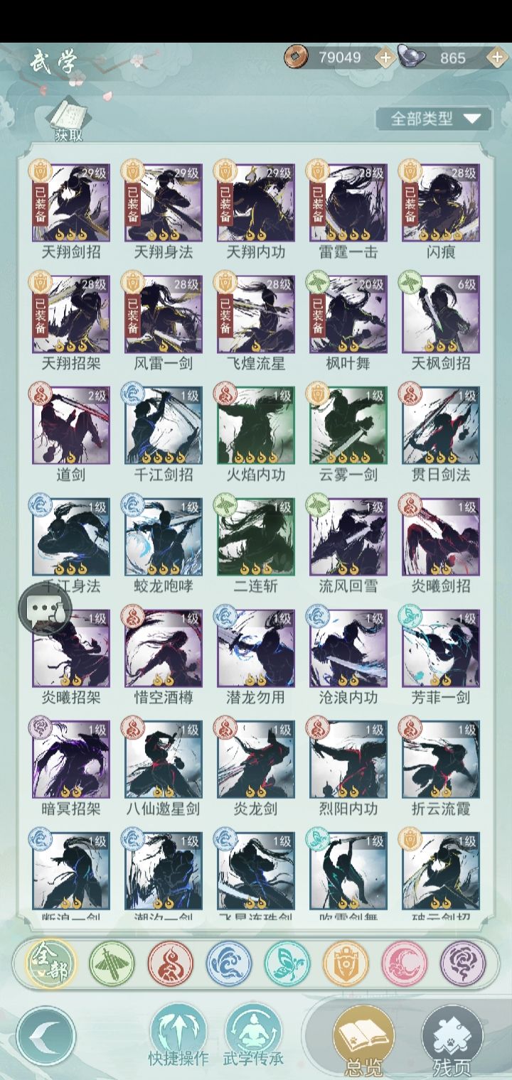 先上武学,都是比较低阶,没有大佬们的5阶,6阶。试了一下9件套天信,觉得还是带枫叶舞比较有操作空间。风雷和终结技都还是自选箱子换出来的,完全贫民。