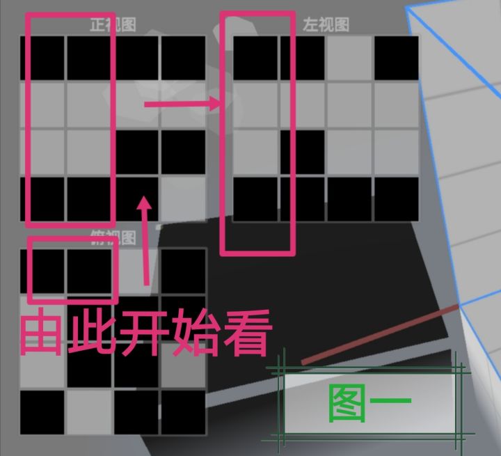 我一般是看俯视图,找一竖行或者一横行、一个单独的格子(最好是从边上开始),然后看这一行在正视图有哪几个不能放,再到左视图看下,除掉不能摆放的格子都摆上。然后以此类推。