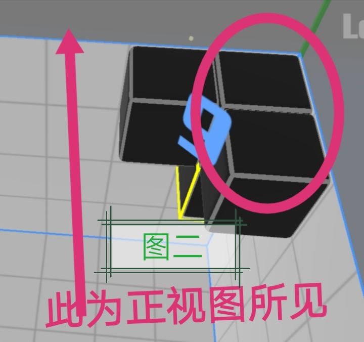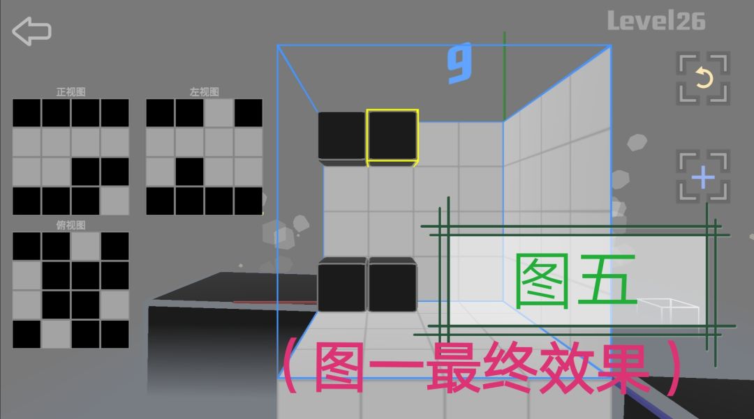 可见由正视图【图二】看,红圈中那一行有两个方块,左视图看【图三】,有两个方块的一行中,有一个方块(红圈中)与图二红圈中的方块重合,俯视图【图四】看,同样是此方块(红圈中)重复(PS:下面有一个黄色框框,那个也是一个方块),那么这个在三视图中都重复的方块就可以删去,因为无论这个方块有没有,都不会影响三视图。