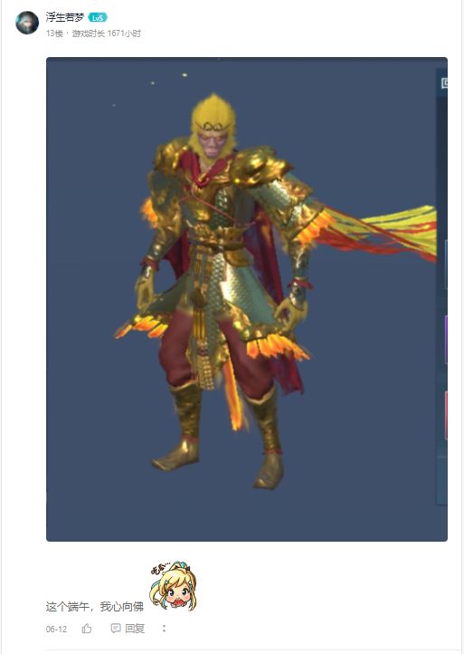 首先吸引我的作品是以为昵称叫浮生若梦的玩家发来的投稿!这名优秀的旅者说他要在端午的时候他要一心向佛,哈哈哈,咪姐真的好喜欢这种很逗的玩家呀!因为他们的存在这个游戏变得更加的轻松了呢!