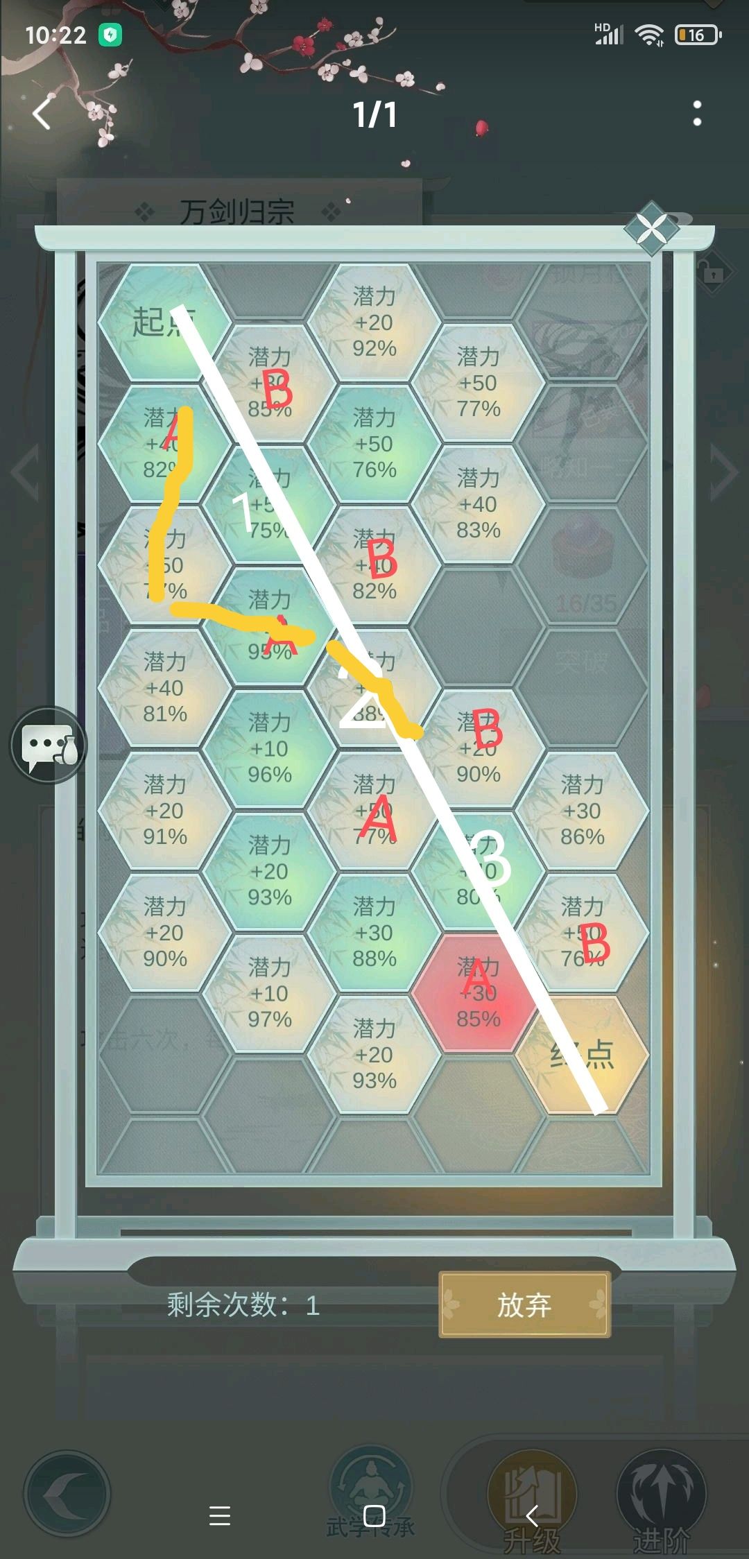 我们的基本思想是一定要沿着起点到终点的一条直线去走,假设上图中的1失败,那么下一步我们一定要走77%(潜力+50)那个点,然后再下一步,我们一定要走下一个非关键方块a