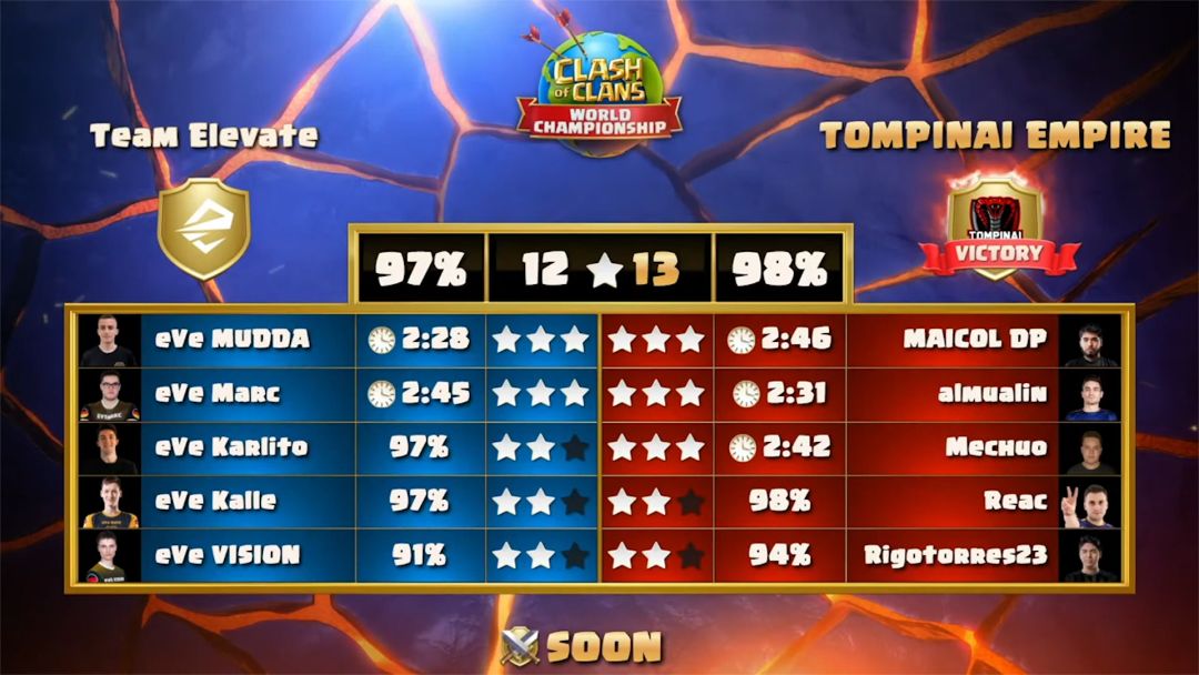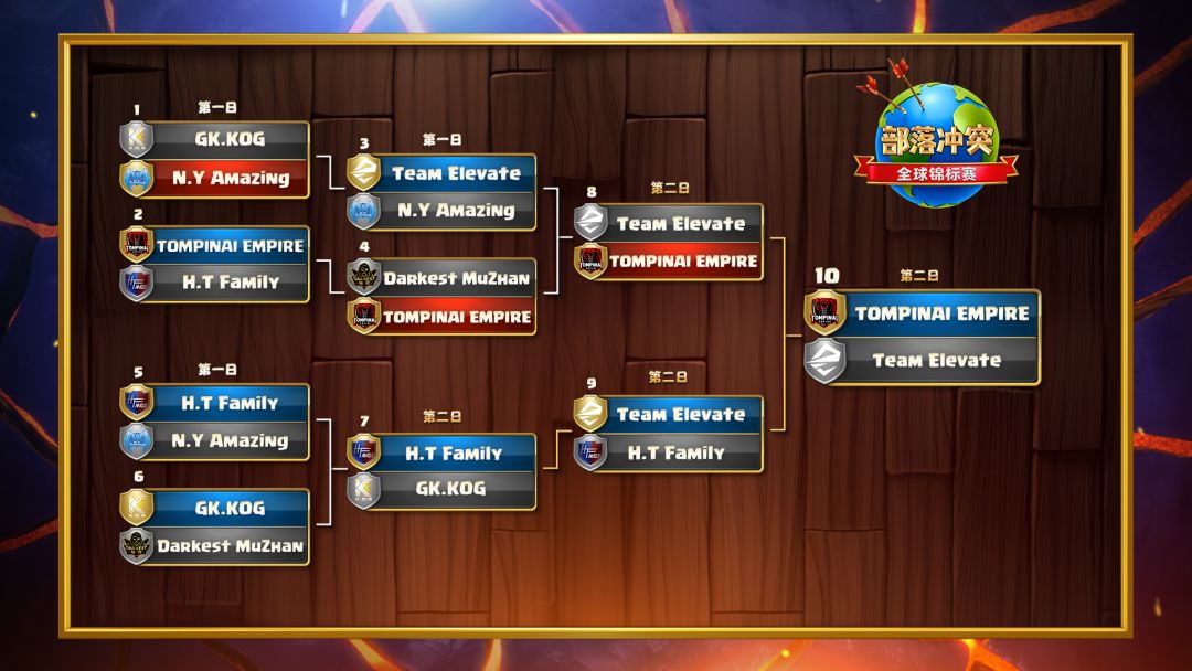 第二场比赛,由Team Elevate对阵TOMPINAI EMPIRE。两支队伍的首发选手都采用了稳扎稳打的策略,而本轮比赛的首个三星胜利由TOMPINAI EMPIRE的2号位选手almualin使用飞龙气球轻松拿下,而Team Elevate的2号位选手eVe Karlito却遗憾失误,仅拿下2星97%摧毁率,TOMPINAI EMPIRE成功掌握赛场主动权。