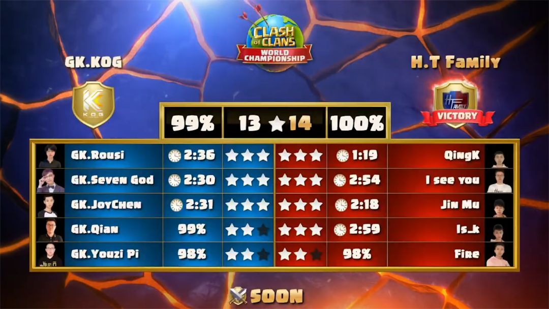 H.T Famil的is_k率先登场迎敌,一手漂亮的狗球干净利落拿下了三星胜利。而GK.KOG的5号位选手GK.Youzi Pi虽是沙场老将,却依旧败给了时间,战至最后一秒,仍有建筑屹立不倒,遗憾收获2星98%摧毁率的战绩。最终比分锁定在14:13,H.T Family拿下首场胜利!