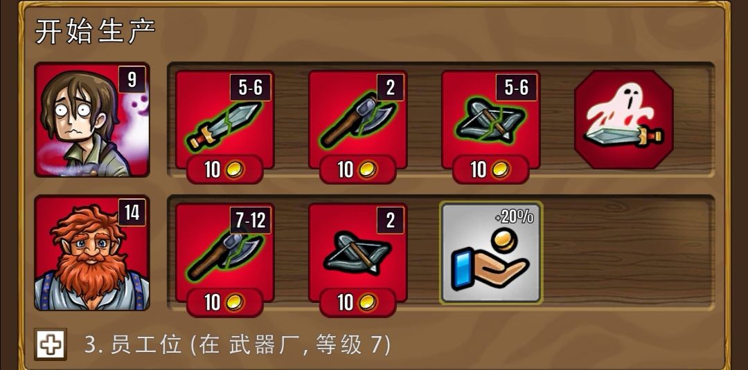 炼金术士建筑物可以造两个,一个用来生产生命药水,另外一个用来生产其他三类药水,生产三类药水建筑物主升,生命药水够用就行。驯兽师这种建筑一个就行,两个就多余了。酒馆两个,一个用来生产酒和食物,第二个生产松子酒和零食,升产酒和食物的主升,另外一个保证能有两个英雄和6个仓库格子就行了,酒馆20之前6级就够用了,仓库位子10个。武器厂也是两个,一个主升另外一个保证五个仓库格子就行了,主升的主要是用于生产剑、斧头、十字弩,前期6级也够用了,另外一个只要生产弓箭,可能有人会说为什么不是一个建筑物生产两种武器,而是一个生产三个,一个只要一个就行了,因为这个队员